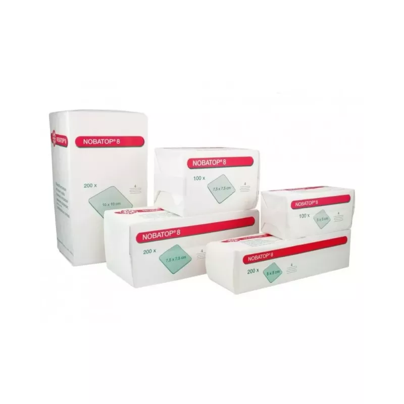 NOBATOP® 8 służy jako materiał bazowy dla opatrunków maściowych. Ze względu na swoją miękkość, NOBATOP® 8 doskonale nadaje się do pielęgnacji jamy ustnej. Może być sterylizowany, a następnie używany jako osłona rany. Przed użyciem na otwartych ranach, włókninowy gazik musi zostać wysterylizowany zgodnie z zatwierdzoną metodą sterylizacji. W papierowe opakowanie zapakowanych jest 100 sztuk włókninowych gazików.