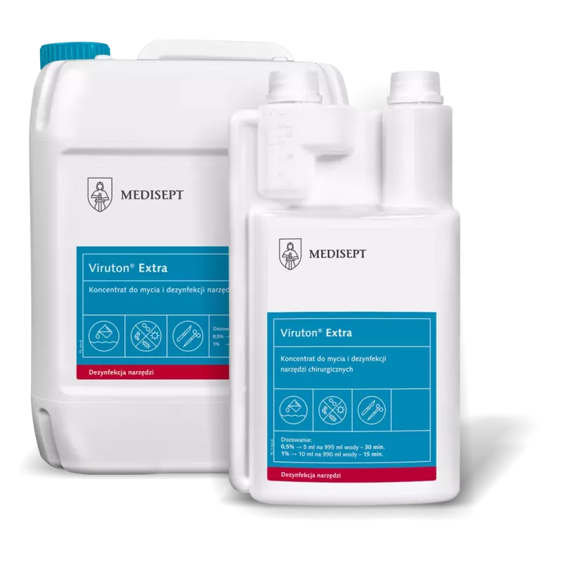 Viruton Extra to wydajny koncentrat przeznaczony do jednoczesnego mycia i dezynfekcji instrumentów chirurgicznych i rotacyjnych. Przeznaczony jest do manualnej dezynfekcji narzędzi oraz dezynfekcji w myjkach ultradźwiękowych. Jest zalecany do instrumentów ze stali szlachetnej, niklu, miedzi, aluminium, gumy, porcelany, szkła i tworzyw sztucznych.